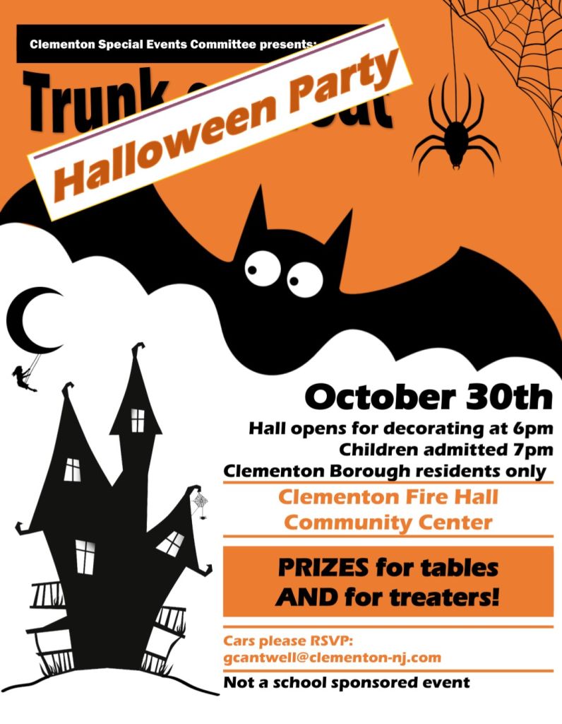 Due to the weather forecasted for 10/30, the Trunk or Treat Event will be moved INDOORS and transformed into a Halloween Party at Clementon Fire Hall/Community Center, located at 165 Gibbsboro Road.